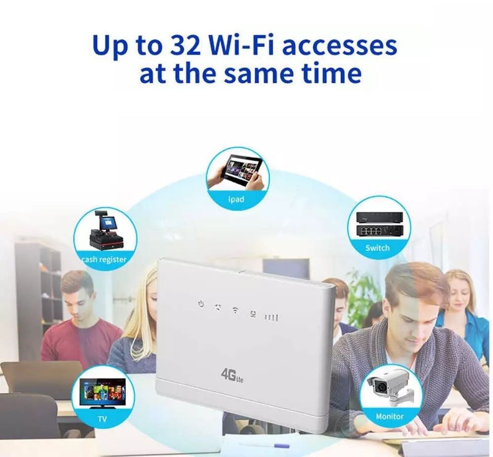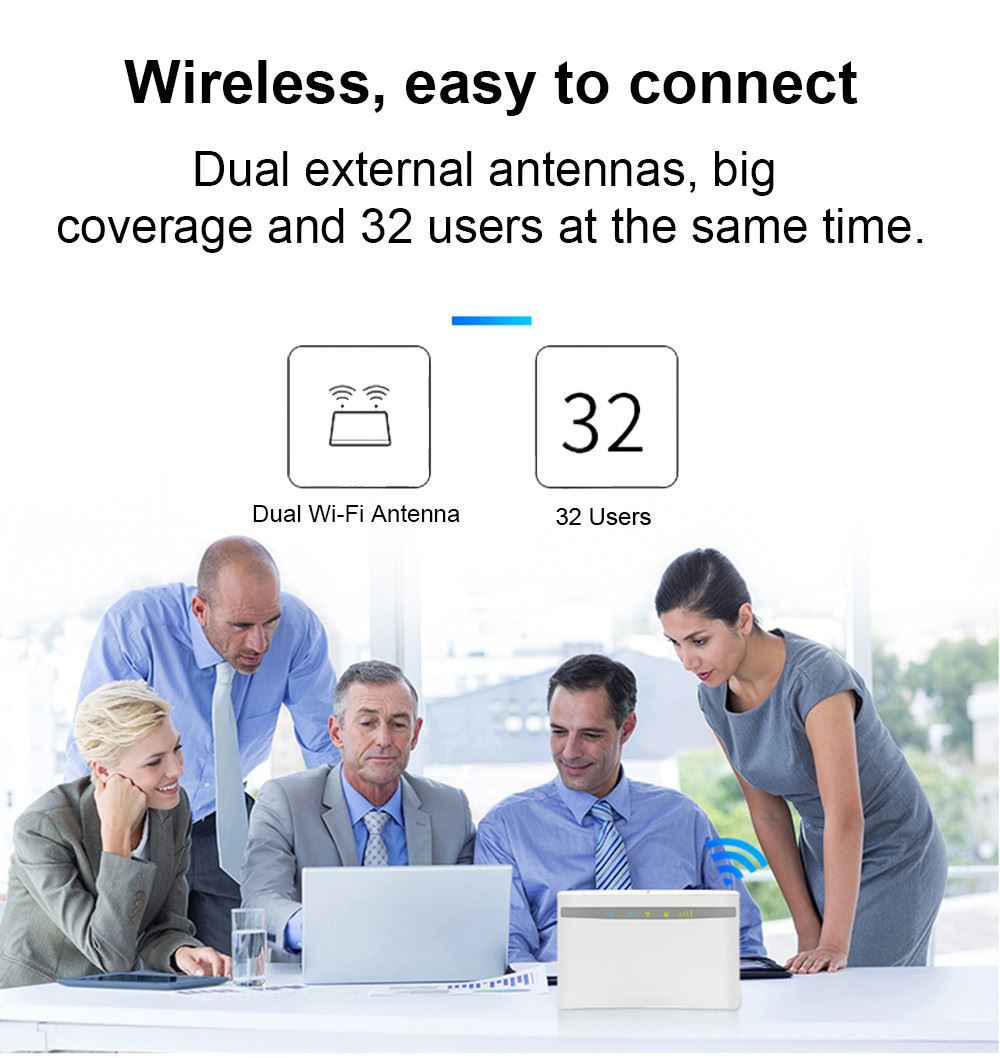 Това е силно напреднал LTE закрит CPE рутер. Тя е предназначена да отговори на интегрираните данни и нуждите от достъп до Wi-Fi за жилищни, бизнес и корпоративни потребители. (може да се свърже с SMA конектор външни антени !) 150M висока скорост, LTE FDD: DL /UL 150M / 50 Mbps (Кат 4). Трансфер 4G до Wi-Fi, Няма нужда от Широколентов достъп, поставете сим карта , щепсел и играйте. WiFi Покрива цял апартамент и къща, насладете се на високоскоростен интернет навсякъде. Лесен за свързване, двойни външни антени, голямо покритие и 32 потребители едновременно.